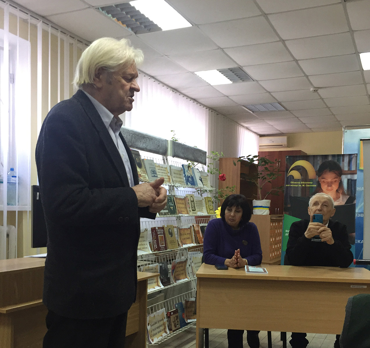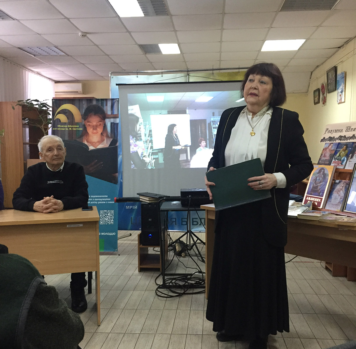 Директорка бібліотеки Ольга Леонідівна Матюхіна сердечно привітала присутніх, нагадала про ювілеї, проведені в цьому ж затишному залі – і Олександри Кравченко, і інших письменників, та запросила творчих особистостей до продовження натхненної плідної співпраці.