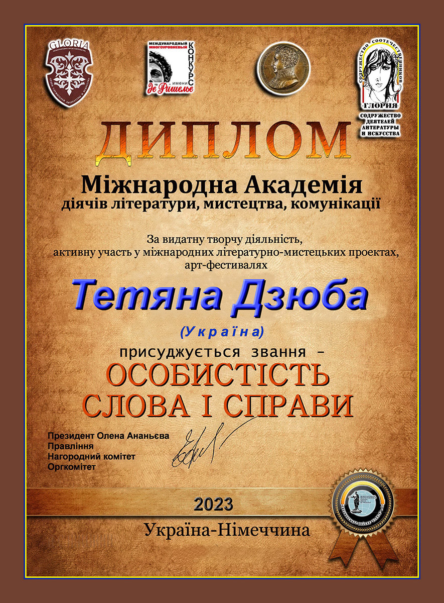 Міжнародна Академія діячів літератури, мистецтв та комунікацій у Німеччині (Франкфурт-на-Майні, президент, письменниця, мистецтвознавець Олена Ананьєва) традиційно, за підсумками 2022-го, на початку нинішнього року нагородила відомих, популярних та патріотичних людей в Україні, – за їхню видатну творчу діяльність, активну участь у міжнародних літературно-мистецьких проектах та арт-фестивалях.