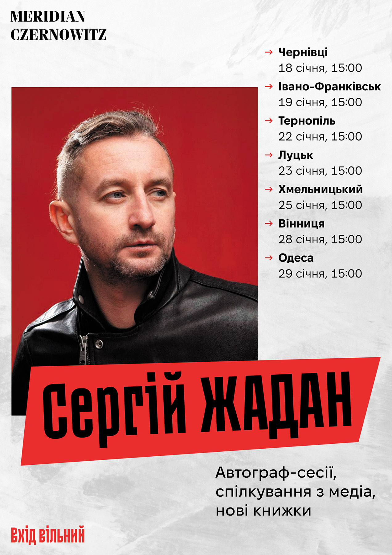 Міжнародна літературна корпорація MERIDIAN CZERNOWITZ запрошує читачів та представників ЗМІ на зустрічі із харківським письменником, музикантом і волонтером Сергієм Жаданом у 7 містах України з 18 по 29 січня 2023 року. Відомий український письменник візьме участь у зустрічах у наступних містах: