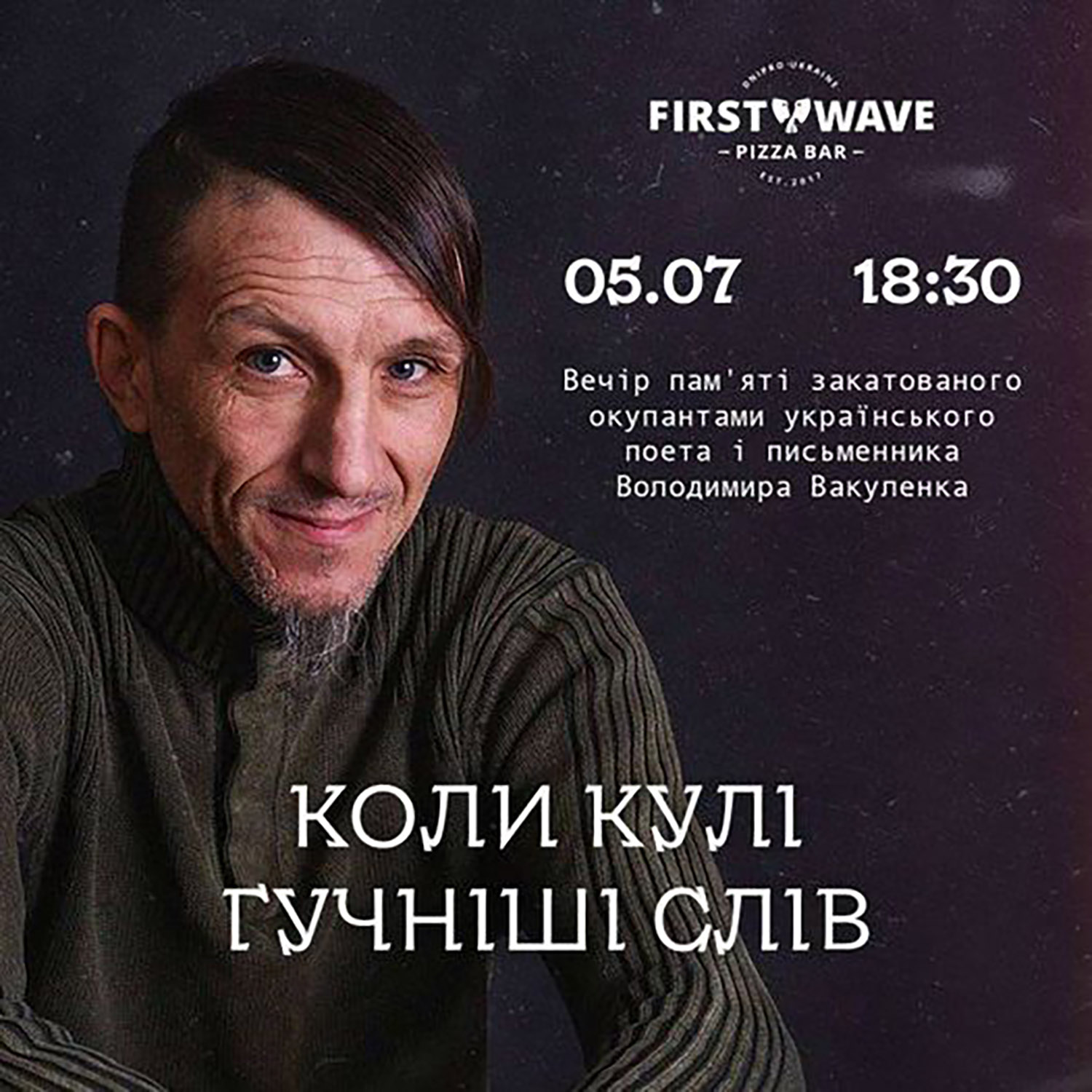5 липня у Дніпрі відбувся вечір пам’яті закатованого рашистами харківського письменника та поета Володимира Вакуленка. У патріотичному осередку міста First Wave Pizza Bar зібралися не лише дружина, шанувальники загиблого літератора, а й добре знані активісти Наддніпрянського краю.