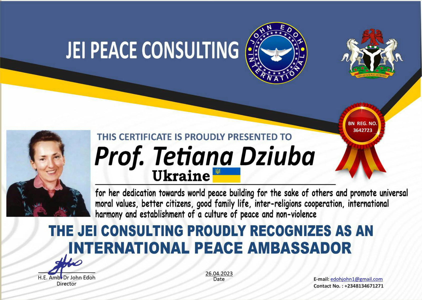 Народні поети України, відомі міжнародні діячі, перекладачі, критики, журналісти, професори Тетяна і Сергій Дзюби отримали почесну нагороду в Нігерії. За поданням нігерійської Принцеси Ловелін Ейо (Lovelyn P. Eyo), щирого друга України, Сергій і Тетяна одержали від «JEI Consulting Nigeria» сертифікати Міжнародних Послів миру.