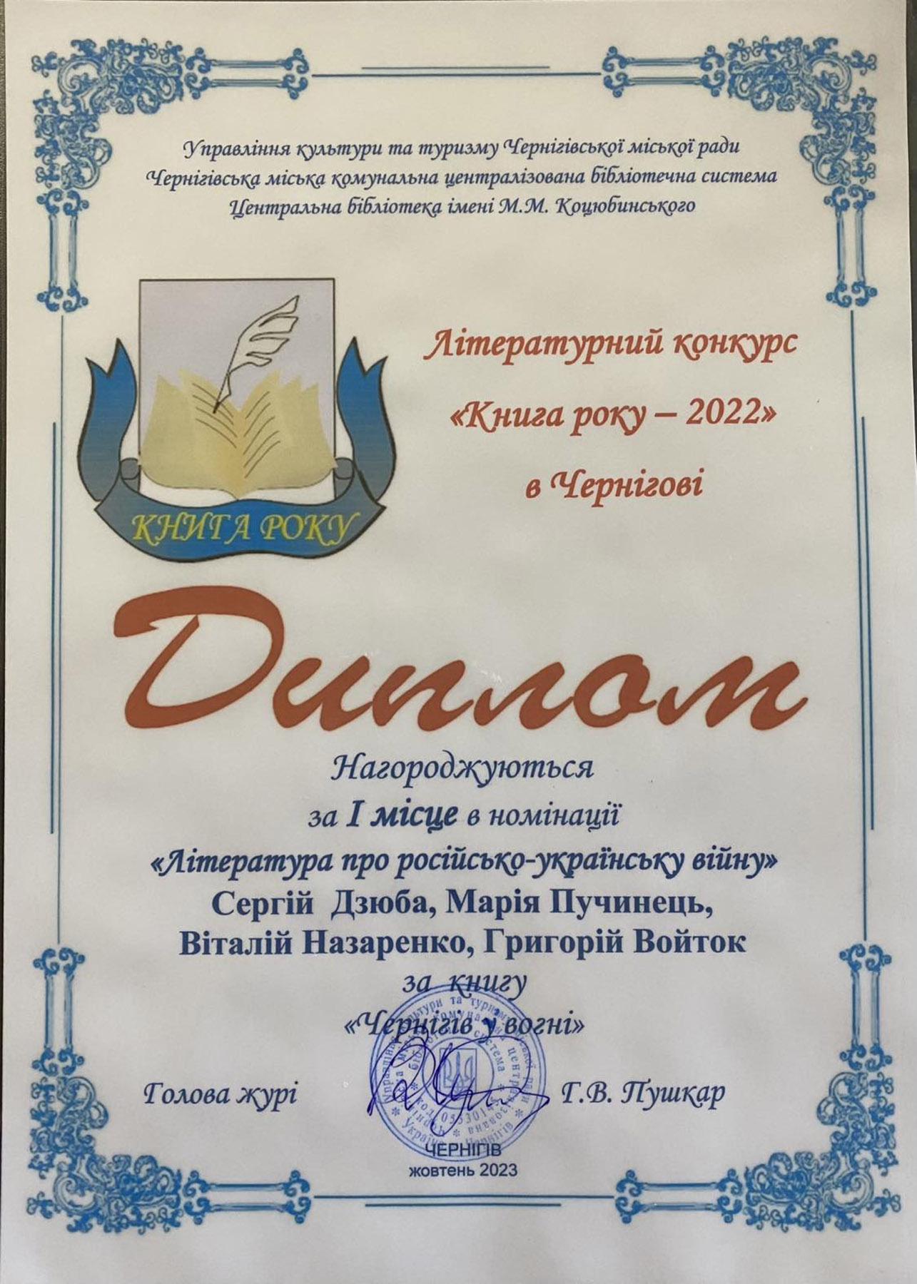 Отже, на урочистостях в бібліотеці ім. М. Коцюбинського лауреатський диплом за почесне перше місце творцям книжки «Чернігів у вогні. Зметем орду, відправимо до пекла!» нещодавно отримав редактор обласної газети «Чернігівщина», письменник і журналіст Сергій Дзюба.