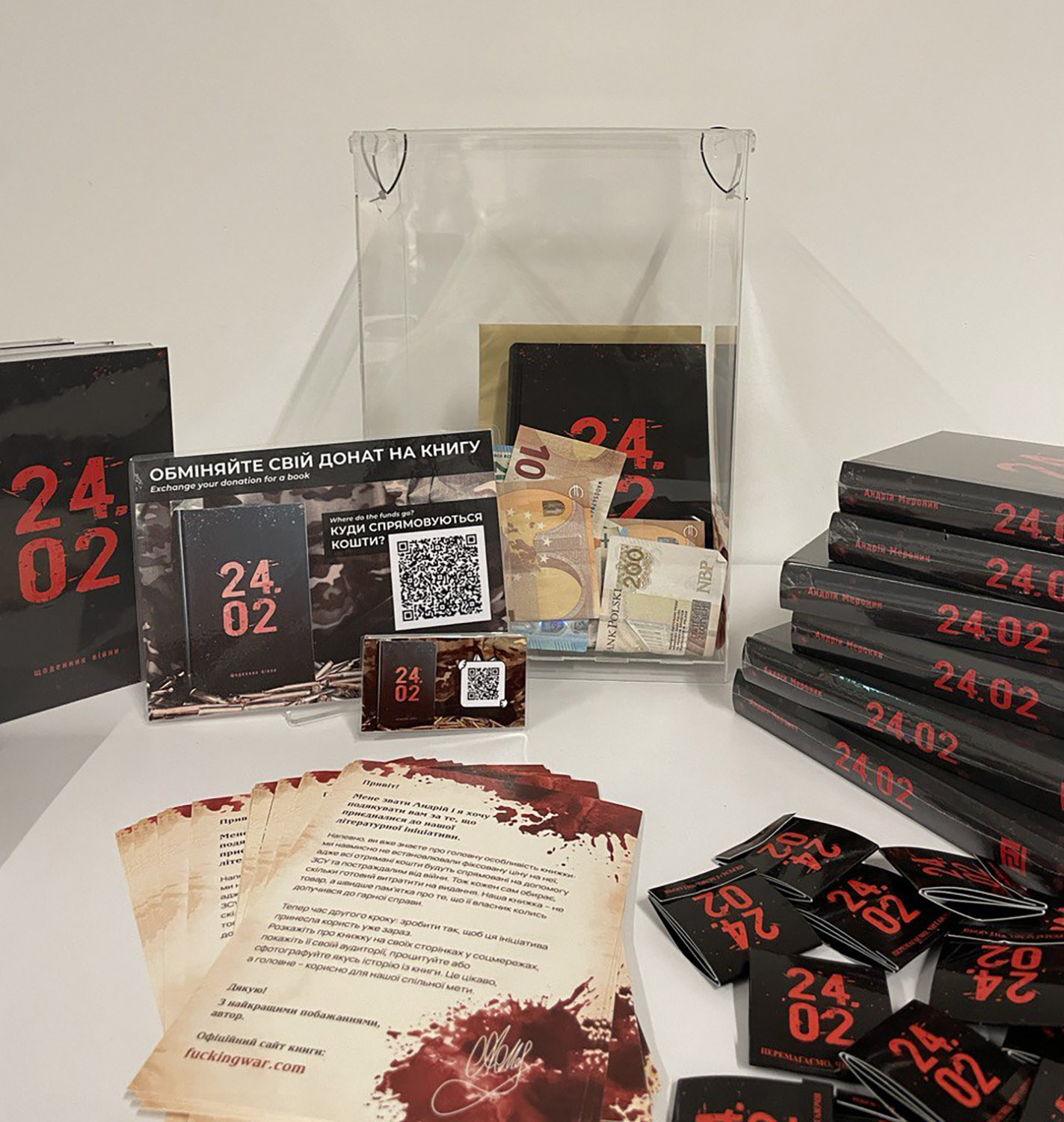 Традиційно книжка «24.02» не продавалася, а обмінювалася на донат: всі відвідувачі заходів мали можливість отримати примірник видання, вкинувши будь-які кошти в прозору скриньку. Загалом було обміняно близько 100 книг на загальну суму більше 50 000 грн. Усі гроші будуть спрямовані на допомогу ЗСУ, зокрема, ремонт евакуаційної техніки.