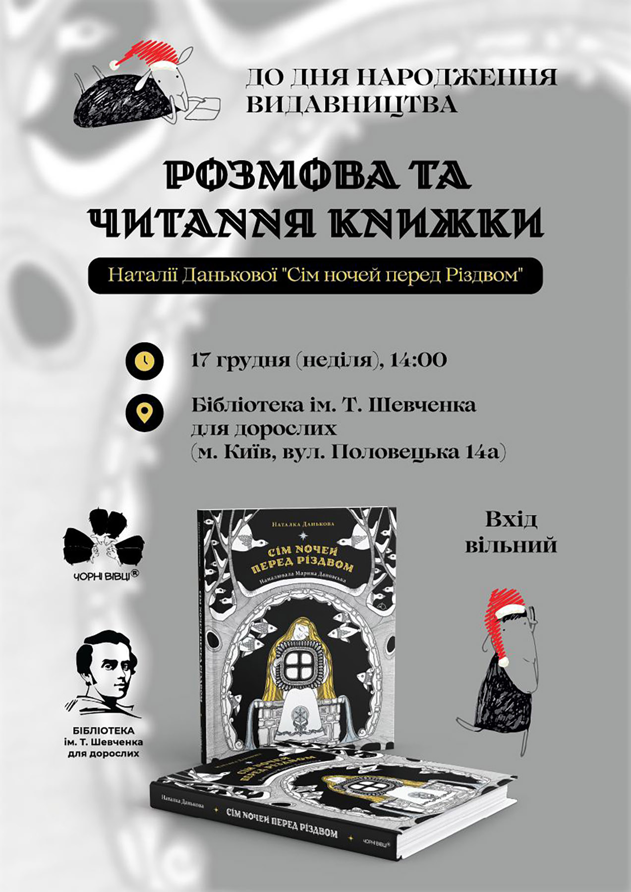 17 грудня (неділя) о 14:00 у бібліотеці ім. Т. Шевченка для дорослих (м. Київ, вул. Половецька 14а) відбудеться розмова та читання дебютної книжки журналістки і письменниці Наталії Данькової «Сім ночей перед Різдвом».
