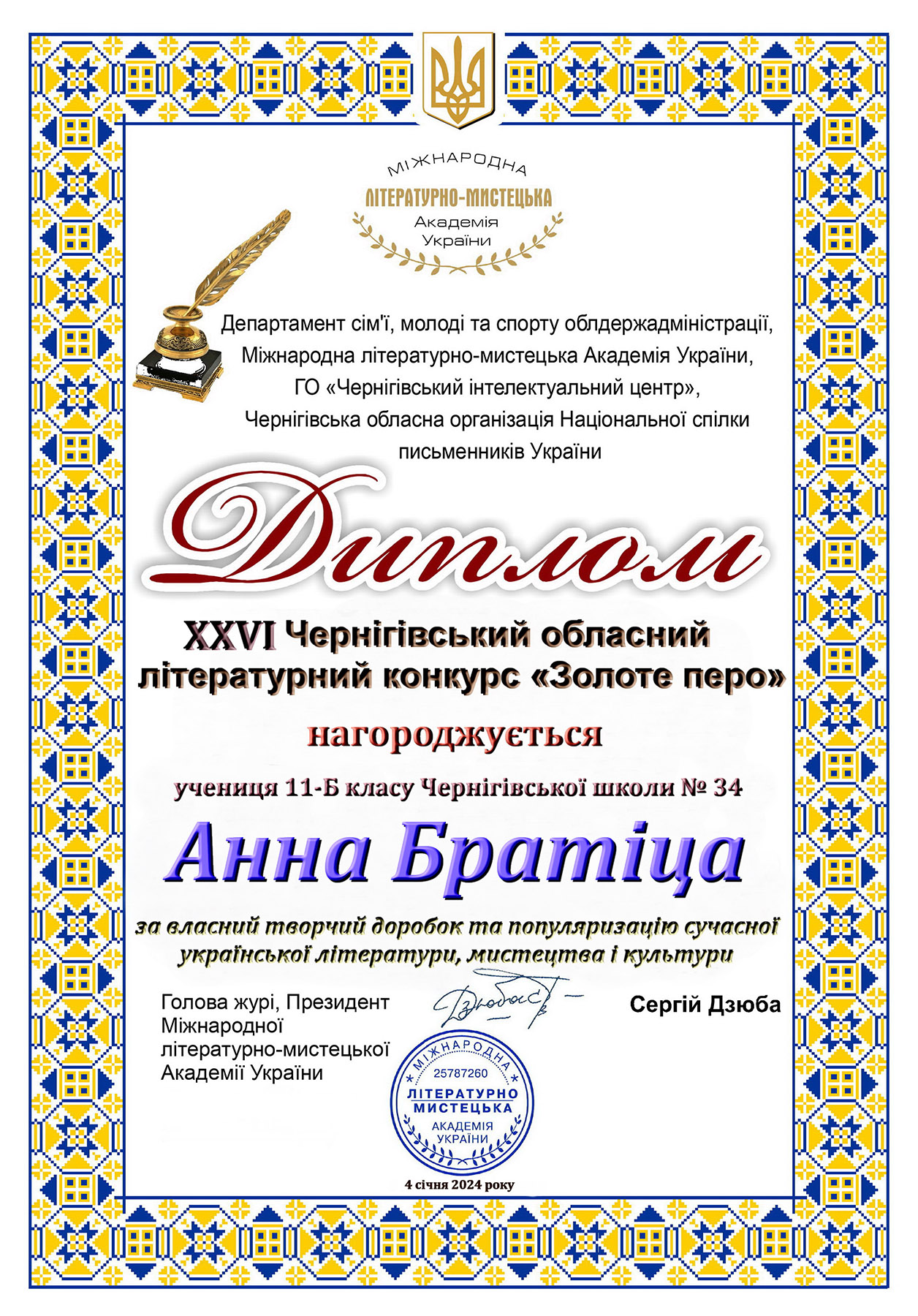 Названо переможця XXVI Чернігівського обласного літературного конкурсу «Золоте перо» за нинішній рік. Цей престижний на Придесенні конкурс постійно проводиться з 1999 року. За увесь час у ньому взяли участь більше п’яти тисяч талановитих молодих людей. Немало з них здобули нині всеукраїнське та міжнародне визнання, стали професійними письменниками, авторами пісень, перекладачами та акторами, видали не одну власну книжку.