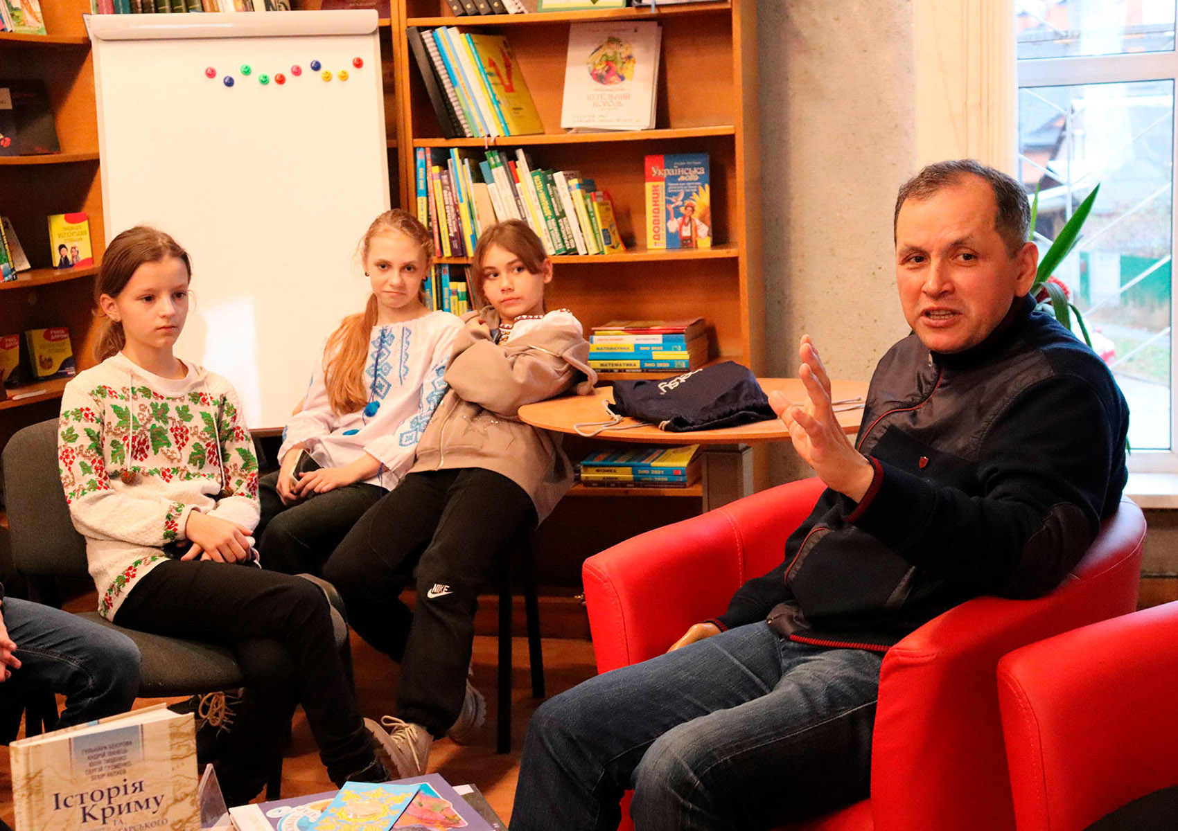 Ерфан Кудусов, голова Центру етнологічних та політичних досліджень Криму, поділився знаннями про традиції та побут кримськотатарського народу, розповів історію депортації власної родини, створення Кримського ханства та його традиції. Він провів дітей крізь багатий світ етнічної самобутності, розповівши про традиційні свята, народні промисли та звичаї, які передаються з покоління в покоління. Пан Ерфан приніс із собою традиційну кримськотатарську сувенірну продукцію, пам’ятні монети та книги. Усе це діти розглядали з цікавістю, а найбільш активні одержали від гостя книжкові подарунки на згадку. Книжкові подарунки отримала і бібліотека.