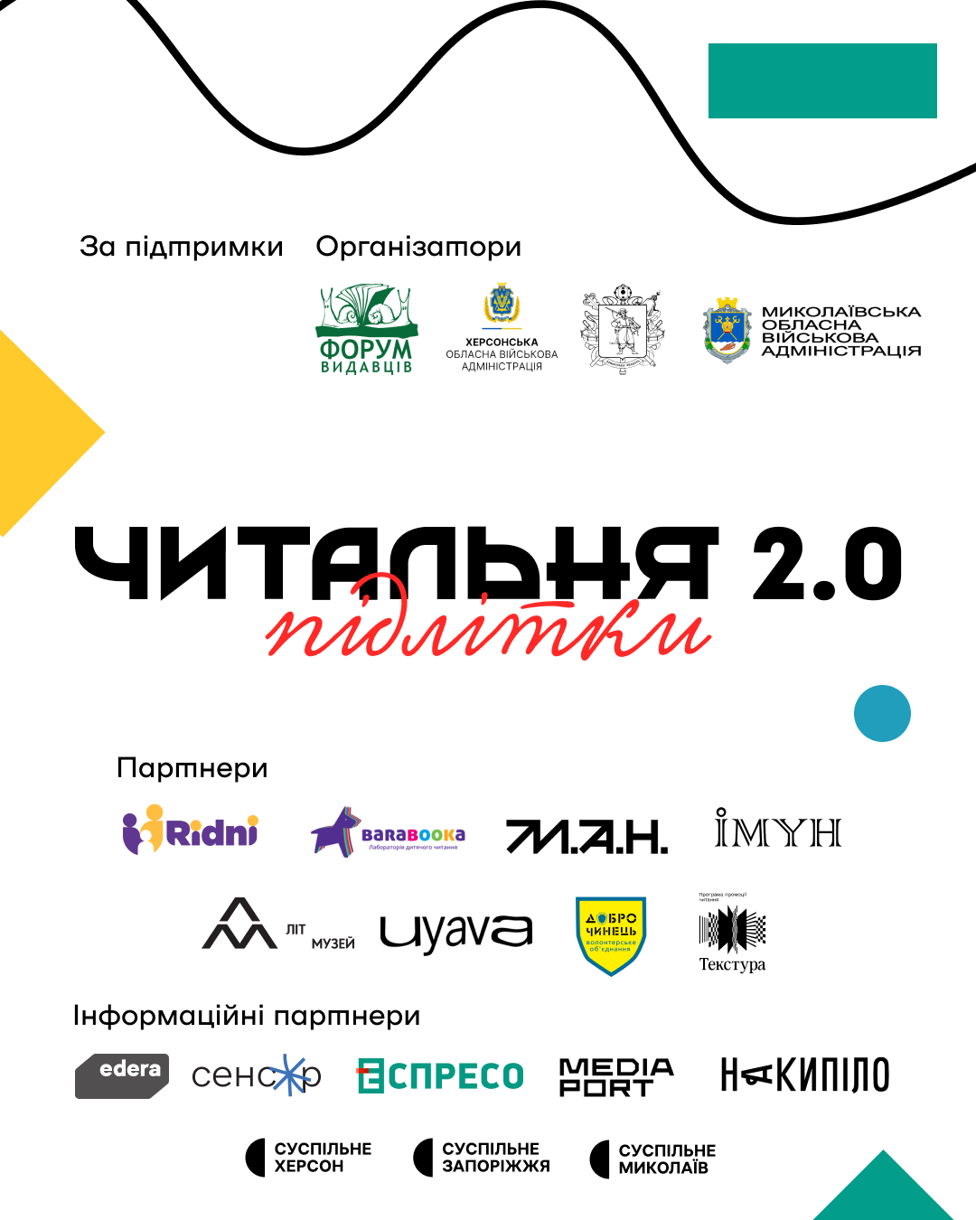 Партнери: Благодійний фонд «Рідні», Простір Української Дитячої Книги «BaraBooka», Лабораторія дитячого читання МАН, ГО «Ініціативна молодь Нью-Йорку», Харківський літмузей, Простір для підлітків та молоді «Уява», ГО «Доброчинець», програма з промоції читання «Текстура»