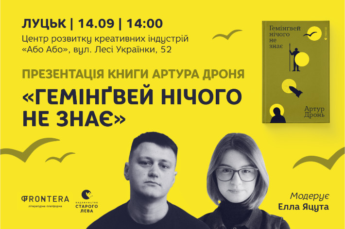 У неділю, 14 вересня, о 14:00 у Центрі розвитку креативних індустрій «Або Aбо» (вул. Лесі Українки, 52) відбудеться презентація книги письменника й ветерана російсько-української війни Артура Дроня «Гемінґвей нічого не знає». Модеруватиме розмову засновниця Літературної платформи «Фронтера» Елла Яцута.
