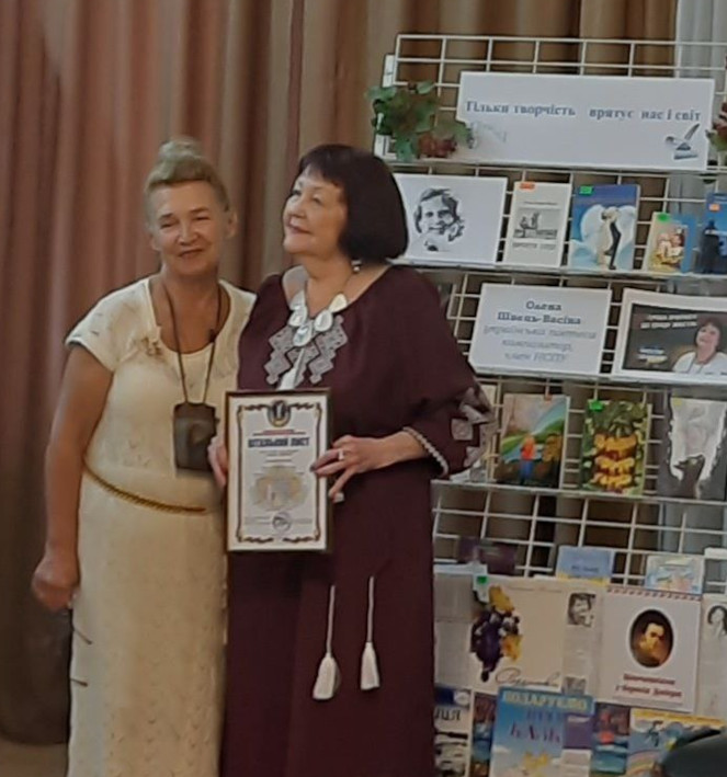 До привітань долучилися й фахівці бібліотеки-господарки: Дарина Грек зачитала вірш Олени Іванівни «Крокує далі Берегиня», а Тетяна Кулик створила до вірша фоновий відеокліп.