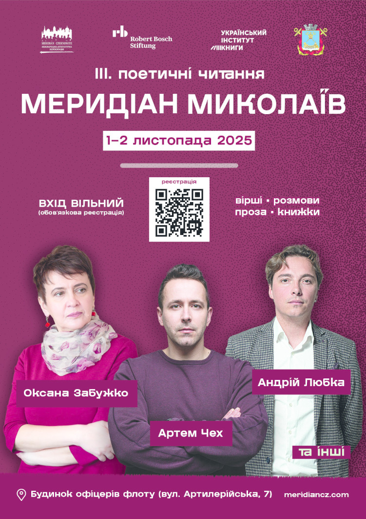 1–2 листопада 2025 року відбудуться дві паралельні великі літературні події — «Поетичні читання Меридіан Одеса» та «Поетичні читання Меридіан Миколаїв», які організовує Міжнародна літературна корпорація Meridian Czernowitz. Обидва заходи мають на меті посилити культурну присутність сучасної української літератури в містах, що є символами незламності та опору. Кожен з дводенних мистецьких заходів запропонує по 9 літературно-дискусійних подій за участі провідних постатей сучасної української літератури і культури. Meridian Czernowitz проводить фестивалі в Одесі та Миколаєві вже третій рік поспіль.