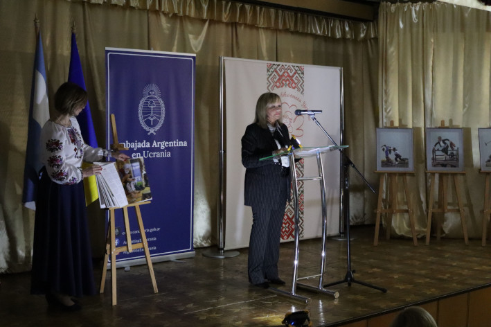 Надзвичайний та Повноважний Посол Аргентинської Республіки в Україні пані Елена Летісія Мікусінскі поділилася з учасниками заходу цікавими фактами про історію Аргентини та аргентинське танго. Вона представила змістовну презентацію про життя гаучо – їхній традиційний одяг, харчування, звичаї, особливості побуту та неповторний спосіб життя на безмежних просторах пампи.