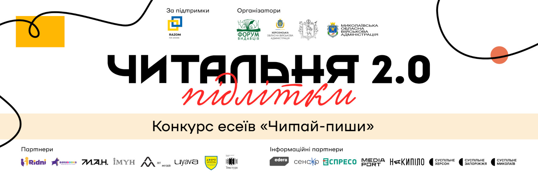 ГО «Форум видавців» оголошує Конкурс есеїв «Читальня 2.0: Читай-пиши» для учнів 5-10-х класів із Запорізької, Миколаївської, Харківської та Херсонської областей. Ми хочемо дати дітям простір, де вони можуть не лише читати, а й писати — говорити про світ своїми словами, вільно і чесно