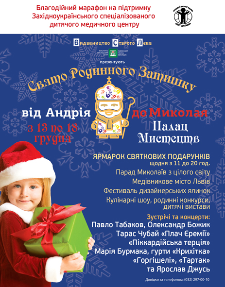 Благодійний марафон «Від Андрія до Миколая» запропонує гостям атмосферу справжнього миколайського дива – з унікальним містом Лева, спеченим із медівникового тіста, ялинкою, створеною руками дітей, парадом Святих Миколаїв із різних куточків світу, насиченою музичною програмою від від відомих виконавців і ще багатьма яскравими подіями.