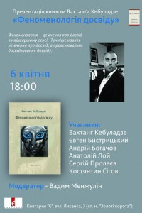 Книгарня «Є» та видавництво «Дух і Літера» запрошують на презентацію книжки Вахтанґа Кебуладзе «Феноменологія досвіду», яка відбудеться 6 квітня за адресою: вул. Лисенка, 3 (ст. м. «Золоті Ворота»).