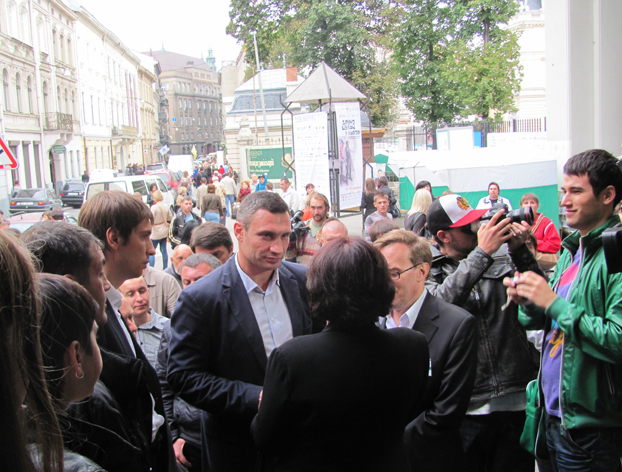Як бачите на фото, В. Кличка при вході до палацу Мистецтв, де відбувається основна експозиція Форуму видавців у Львові, зустрічає президент форуму Олександра Коваль. Планувалося таке, чи ні, важко сказати, але якщо вже коментувати, то хіба що звернувшися знову до тої фрази, яка пролунала на прес-конференції – про знаковість участі в підтримці форуму (і, одночасно використанні його іміджу) «Київстару».